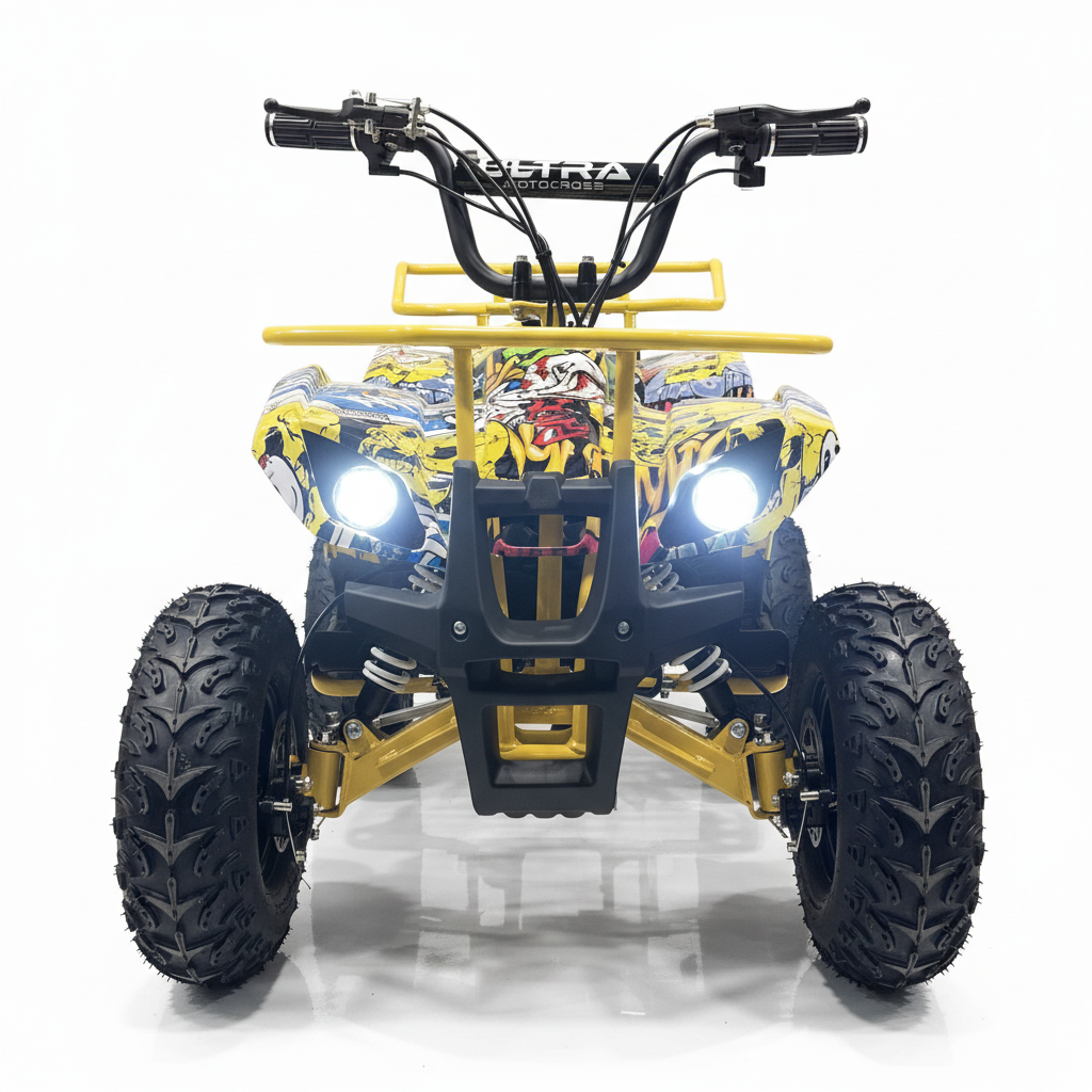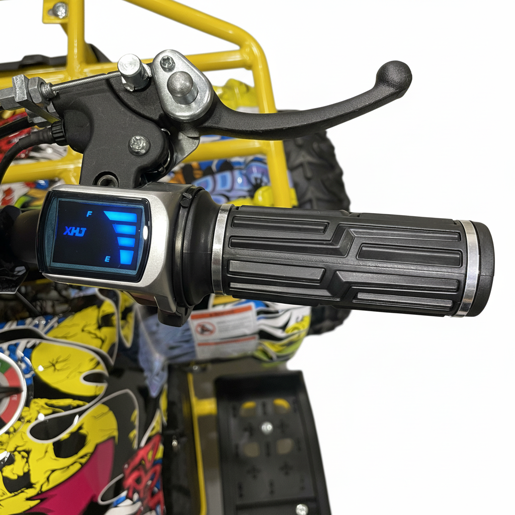 Deze elektrische kinderquad is geel van kleur voorzien van een speciale print. Dit ziet er fenomenaal uit. De stoere uitstraling wordt nog eens versterkt dankzij de felle ledverlichting. Bijkomend voordeel van deze verlichting is dat de quad te allen tijde goed zichtbaar is. Deze kinderquad kan zowel voor- als achteruit rijden en het is een fluitje van een cent om deze kinderquad te bedienen. Deze 1000 watt brushless kinderquad heeft ook een neutrale stand. De maximale snelheid van deze elektrische kinderquad is 30 km/u. Je kunt de maximale snelheid ook instellen op 5 km/u of 15 km/u met behulp van de uitneembare sleutel. Zo behoud je als ouder zelf de controle. De bagagedrager voor en achter is perfect voor het vervoeren van diverse spullen.