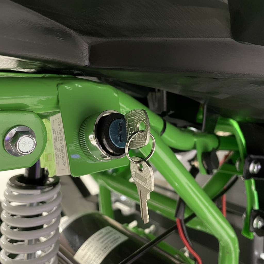 Met een maximale snelheid van 30 km/h is er aan snelheid geen gebruik. Wat zal jouw kleine snelheidsduivel genieten van dit model. Deze groene kinderquad is voorzien van een begrenzer met sleutel. Naast de neutrale stand zijn er drie snelheidsstanden: 5 km/h, 15 km/h en 30 km/h. Een oudersleutel wordt meegeleverd. Bijkomend voordeel van deze groene elektrische kinderquad is het rijcomfort. Dit model is voorzien van een lederen zitting en voor en achter zijn er geperforeerde remschijven. Dankzij de voorverlichting is deze kinderquad altijd duidelijk zichtbaar en kan er ook in het donker op worden rondgereden.