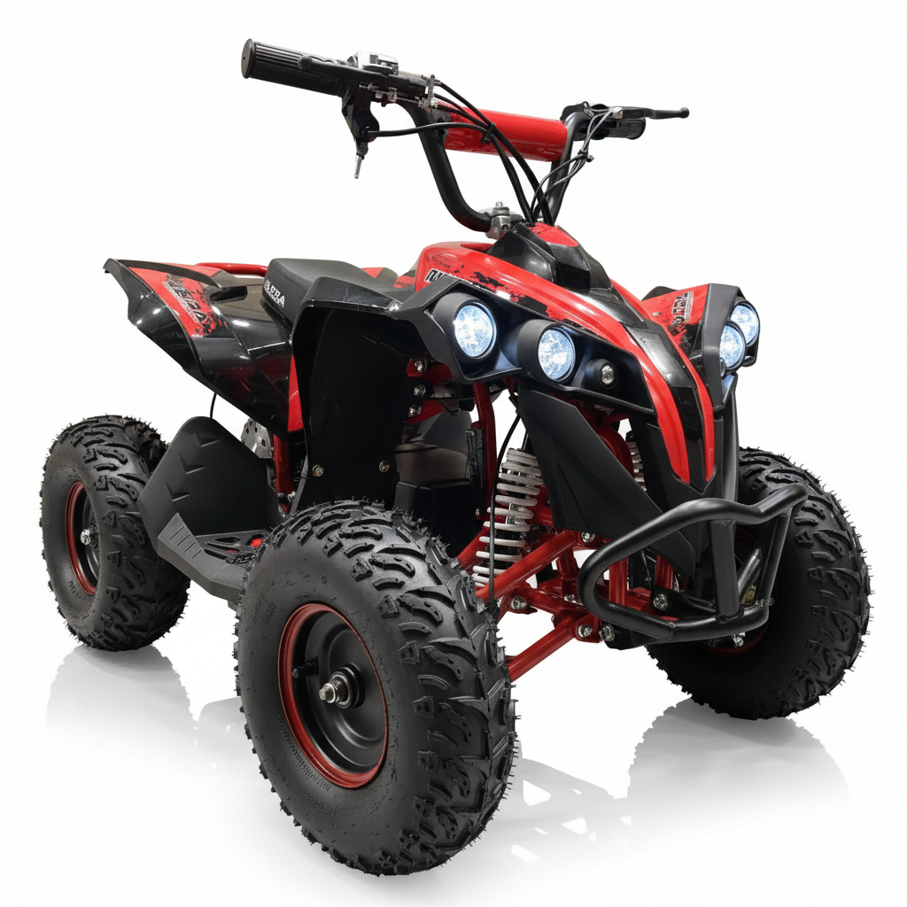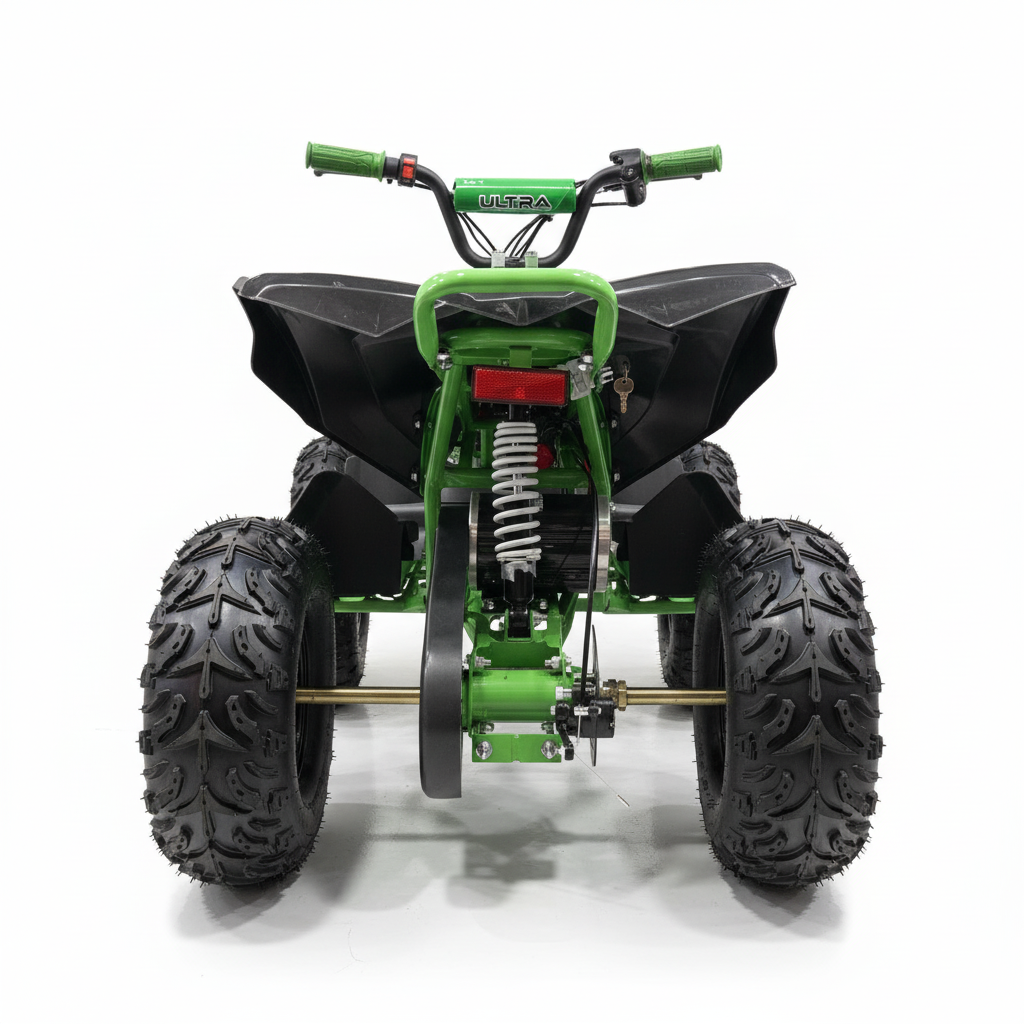Het is haast indrukwekkend hoe flink deze kinderquad is. Meteen valt het grote en zwaardere frame op. Gelukkig maakt het frame dit model niet te topzwaar, want de sterkere veringen kunnen alles aan. Deze kinderquad beschikt niet alleen over 1000W aan vermogen, maar ook een 48V accu en rubberen luchtbanden. De brushless motoren staan bekend om hun extreem lange levensduur en ongekende vermogen, deze motoren hebben 40 tot 50% meer vermogen dan de standaard motoren. De combinatie van deze eigenschappen zorgt ervoor dat dit model over bijzonder veel kracht beschikt. Je kunt met deze groene elektrische kinderquad over alle ondergronden rijden, hoe ruw het terrein ook is. Of je kindje nu thuis op het eigen terrein rijdt of over modderige en zanderige parcoursen, deze kinderquad is tegen alles bestand.