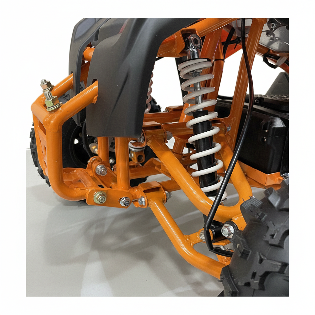 Deze elektrische kinderquad is oranje van kleur. Dit ziet er fenomenaal uit. De stoere uitstraling wordt nog eens versterkt dankzij de felle ledverlichting. Bijkomend voordeel van deze verlichting is dat de quad te allen tijde goed zichtbaar is. Deze kinderquad kan zowel voor- als achteruit rijden en het is een fluitje van een cent om deze kinderquad te bedienen. Deze 1000 watt brushless kinderquad heeft ook een neutrale stand. De maximale snelheid van deze elektrische kinderquad is 30 km/u. Je kunt de maximale snelheid ook instellen op 5 km/u of 15 km/u met behulp van de uitneembare sleutel. Zo behoud je als ouder zelf de controle.