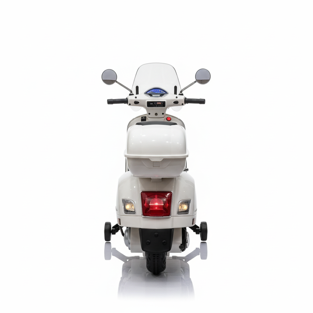Deze Vespa scooter voor je kind is compleet veilig dankzij de steunwielen. Deze wielen voorkomen dat je kind om kan vallen. De kinderscooter kan zowel voor als achteruit rijden (maximaal 5 km/u) en is voorzien van een gaspedaal. Deze Kinder Vespa remt vanzelf op het moment dat er gestopt wordt met gas geven. Dankzij de claxon is deze scooter altijd te horen. In deze elektrische Vespa voor je kind zijn een USB- en AUX aansluiting te vinden. Tijdens het rijden kan je kind dus luisteren naar zijn of haar favoriete muziek.