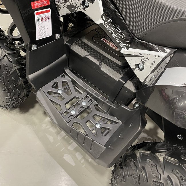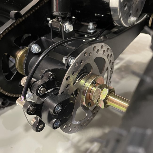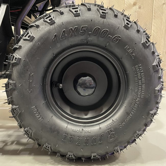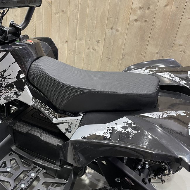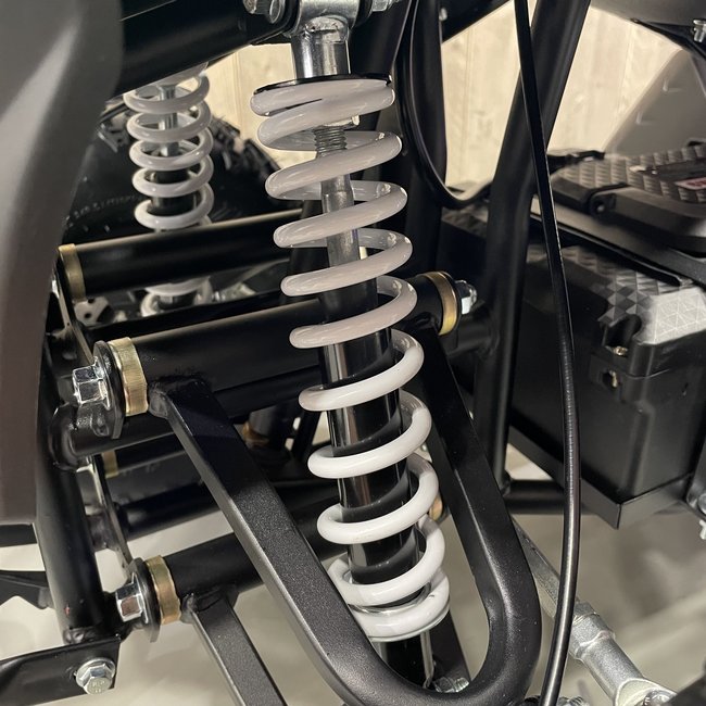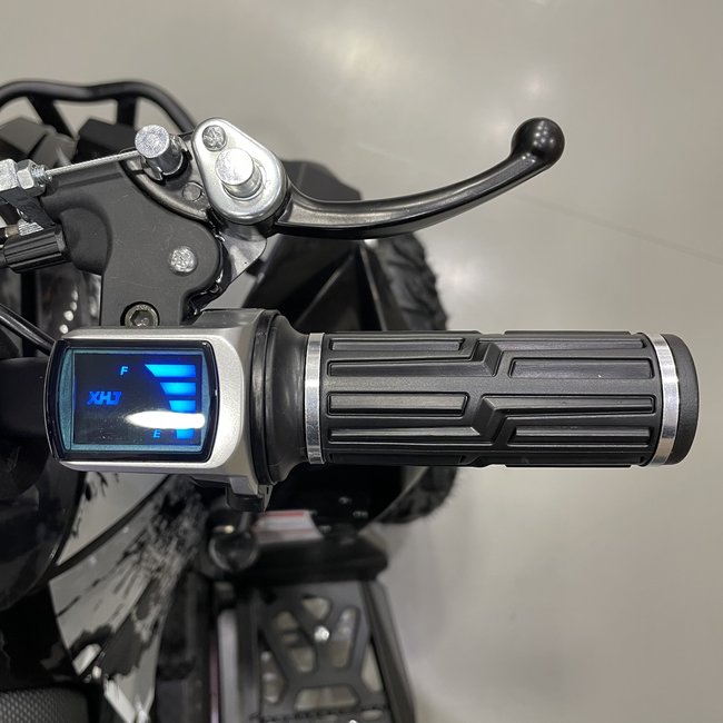 Deze zwarte kinderquad is een echt beest. In vergelijking met het 800W model is te zien dat het frame groter en zwaarder is. Niet voor niets kan deze kinderquad een gewicht tot maximaal 90 kg aan. Het stevige frame gaat gepaard met sterke veringen die een hoop kunnen hebben. Hierboven benoemden we al het hoge vermogen van 1000 watt, maar wist je dat dit model ook voorzien is van een 48V accu? Hoe hoger het voltage van een accu, hoe meer kracht een kinderquad heeft. Combineer dat met rubberen luchtbanden, en je begrijpt waarom geen enkel terrein een probleem is voor dit model.